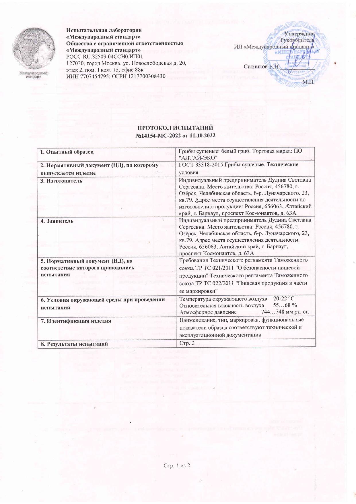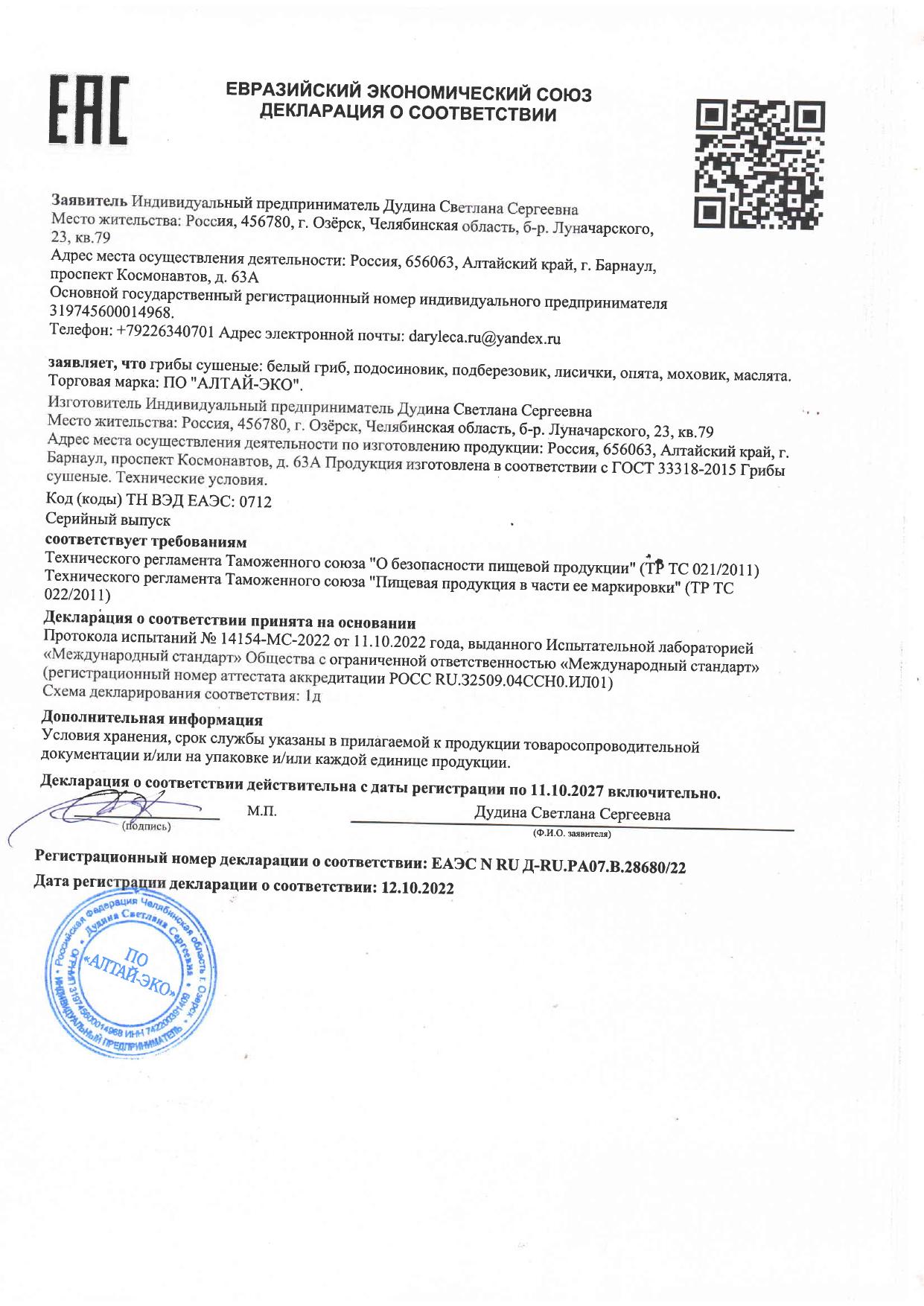 Наше предприятие ПО «Алтай-Эко» (ИП Дудина С.С. ИНН 742200391409)предлагает Грибы Белые сушеные. Грибы соответствуют ГОСТу 33318-2015, а также полностью отвечают требованию технического регламента ТР ТС 021/2011 и ТР ТС 022/2011 Евразийского Экономического Союза (фото продукции и документы в низу страницы). Сбор и переработка дикоросов производится в экологически чистых районах Алтайского края. Наше предприятие занимается сбором и заготовкой дикоросов в сушеном виде уже более 12 лет. Имеем опыт работы с предприятиями пищевой промышленности.